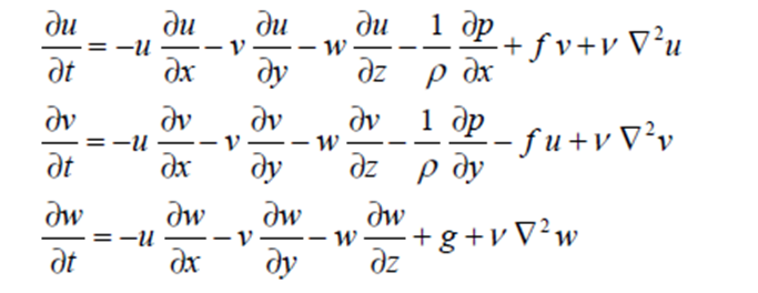 뉴턴의 운동 제2법칙, 운동량 보존 법칙으로부터 유도된, 자전하는 지구 상에서의 유체의 힘의 균형을 나타내는 N-S 방정식은 아래와 같다