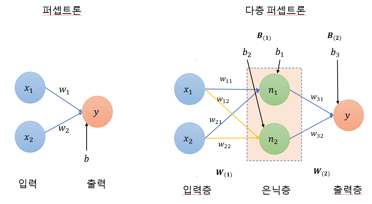 XOR 문제를 해결하기 위해서는 2개의 퍼셉트론을 한번에 계산할 수 있어야 하는데, 은닉층(hidden layer)를 사용하면 가능함.